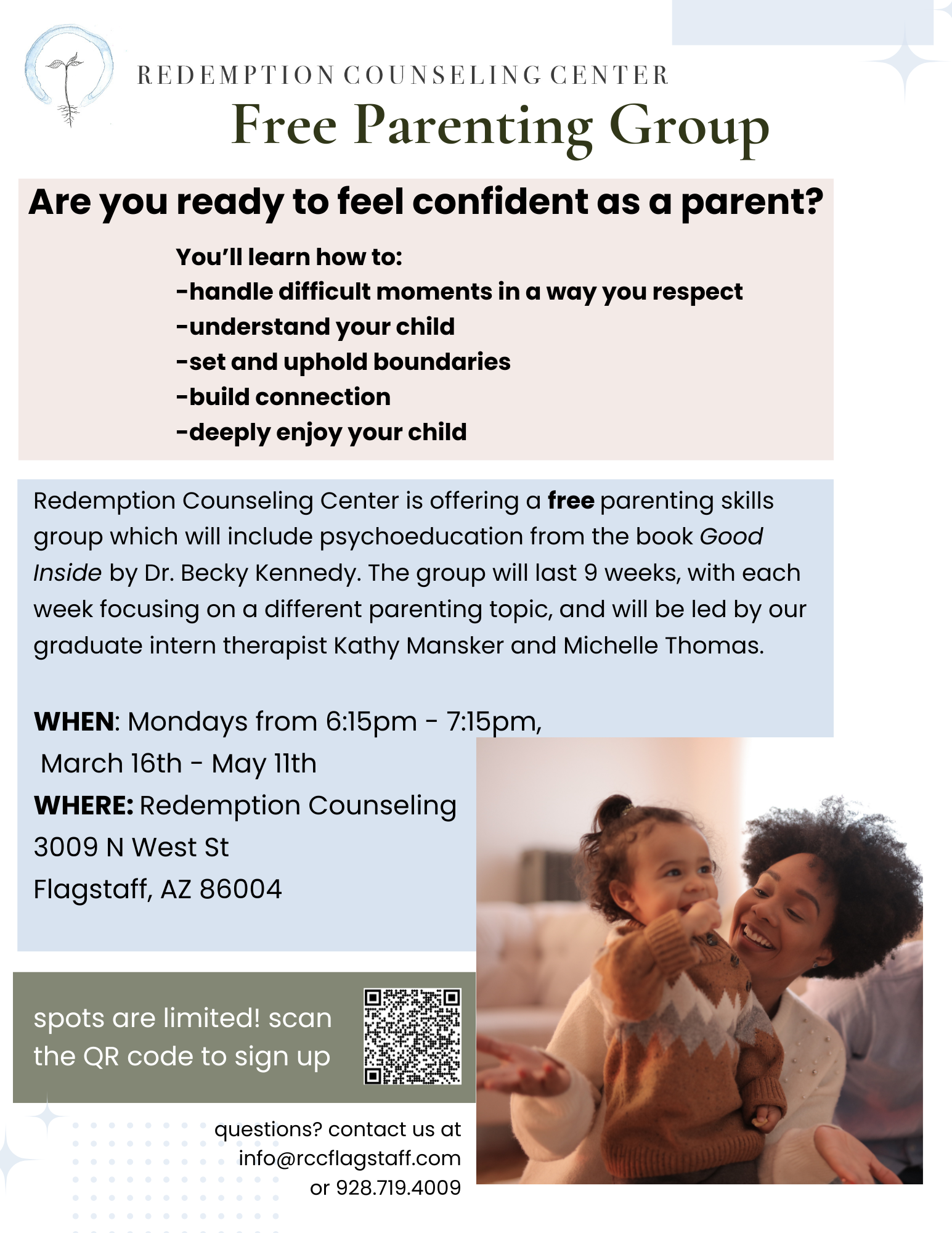 Redemption Counseling Center offers a free parenting skills group offering psychoeducation from the book Good Inside by Dr. Becky Kennedy. Each of the nine weeks focuses on a different parenting topic. The next group will begin March 16th, from 6:15-7:15 PM with our graduate interns Kathy Mansker and Michelle Thomas. Please complete the interest form below to be notified of further details as soon as they become available.